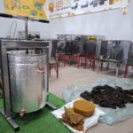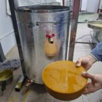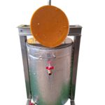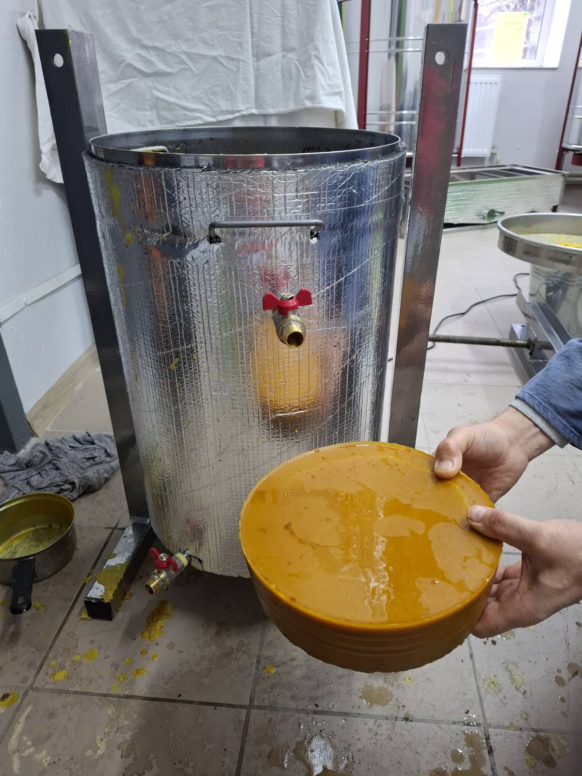 Далі слід підставити під верхній кран посуд для збору воску. Відкрити кран та впустити в посудину розтоплений віск з водою (в розтопленому стані він збирається в баку зверху).